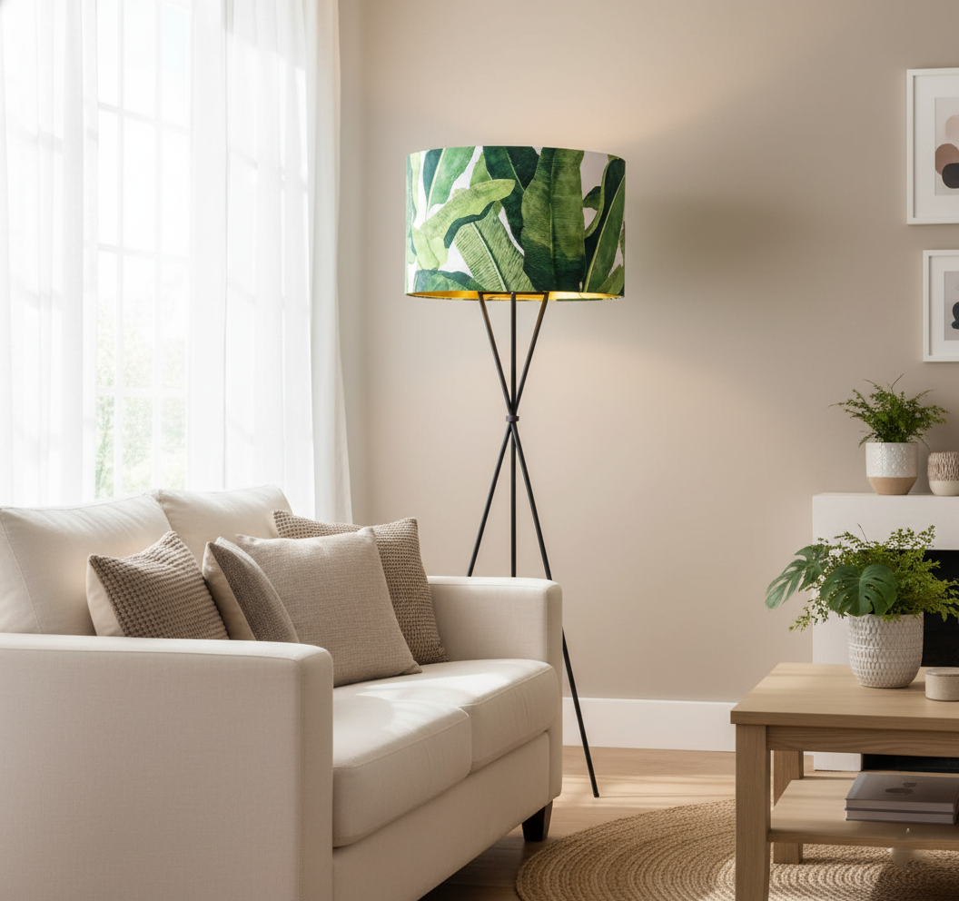 Bring nature-inspired elegance to your space with this stunning green drum lampshade, featuring a bold, large leaf pattern. The intricate design is complemented by a warm, golden interior that reflects a soft, inviting light, creating a cozy and sophisticated ambiance. Perfect for adding a touch of greenery and luxury to your living room, bedroom, or office.